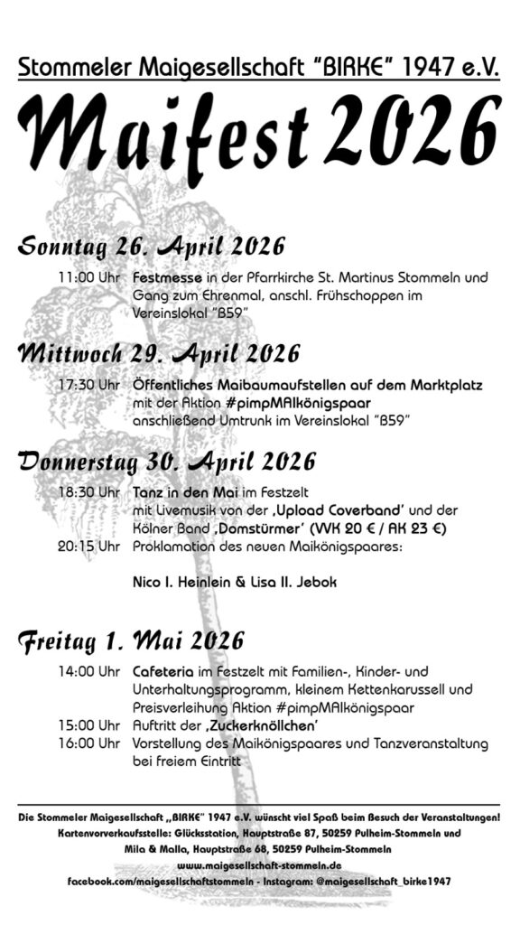 Mit diesem Post möchten wir Euch unser diesjähriges Festprogramm präsentieren! An insgesamt drei Tagen dreht sich in Stommeln wieder alles um die Birke und um das gemeinsame Feiern!